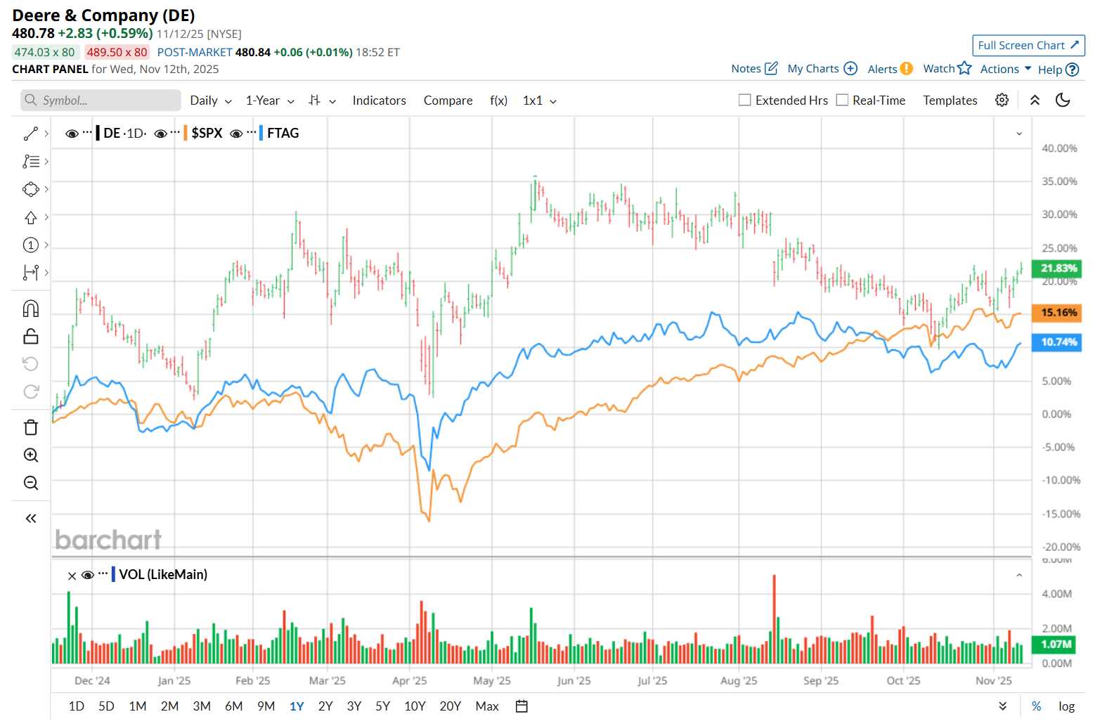 Zooming in further, DE has outperformed the First Trust Indxx Global Agriculture ETF’s (FTAG) 10.1% uptick over the past 52 weeks and 12.7% YTD rise.