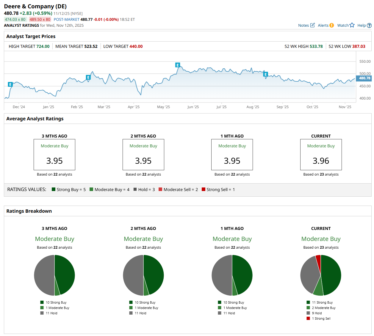 On Oct. 28, Adam Seiden from Barclays PLC (BCS) maintained a “Buy” rating on DE, with a price target of $530, indicating a 10.2% potential upside from the current levels.