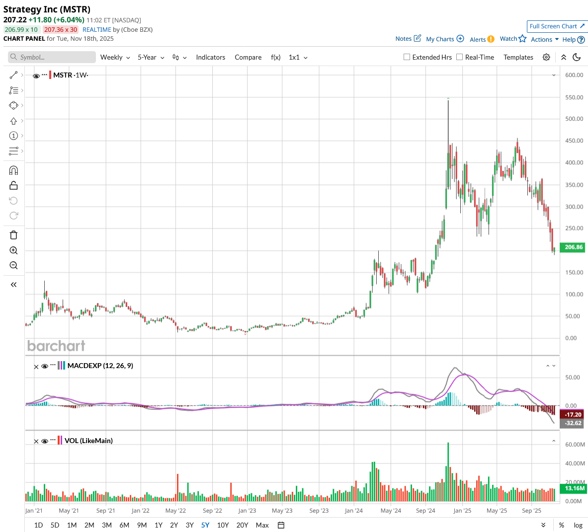 Strategy (MSTR), also known as MicroStrategy, has seen its stock plunge 30% in just one month as Bitcoin's (BTCUSD) dramatic selloff sent shockwaves through cryptocurrency markets. The software company that turned Bitcoin treasury holder saw its shares tumble alongside the digital asset's drop below $95,000, erasing most of the gains made in 2025.