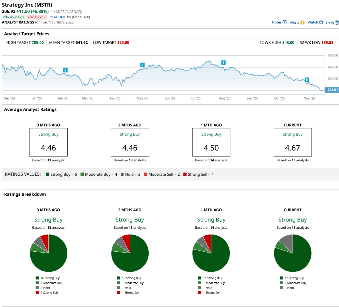 MicroStrategy's success ultimately hinges on Bitcoin maintaining its long-term upward trajectory while the company continues to innovate in the digital credit space. Out of the 15 analysts covering MSTR stock, 12 recommend “Strong Buy,” one recommends “Moderate Buy,” and two recommend “Hold.” The average MSTR stock price target is $541.62, significantly above the current trading price of $207.