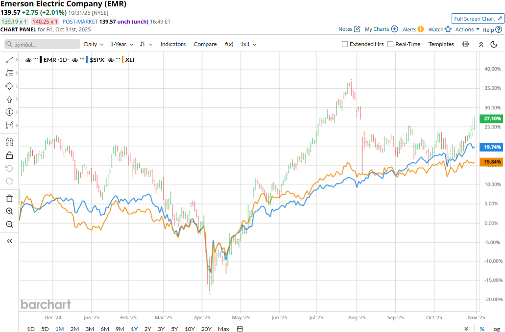 The stock has lagged behind the broader market in 2025, but significantly outperformed over the past year. EMR has surged 12.6% in 2025 and soared 28% over the past year, compared to the S&P 500 Index’s ($SPX) 16.3% gains on a YTD basis and 17.7% returns over the past year.
