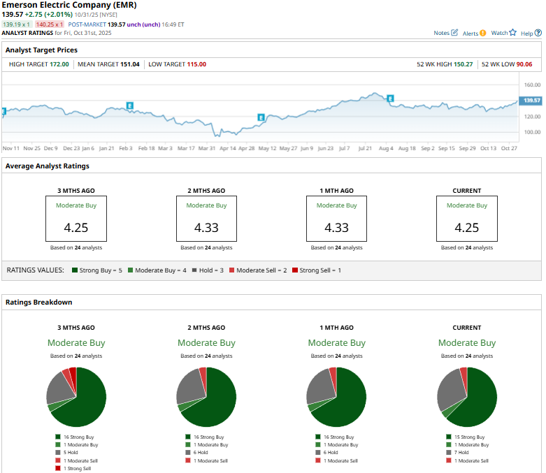 On Oct. 15, JP Morgan (JPM) analyst Stephen Tusa maintained a “Neutral” rating on EMR and raised the price target from $135 to $151.