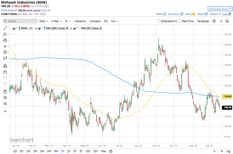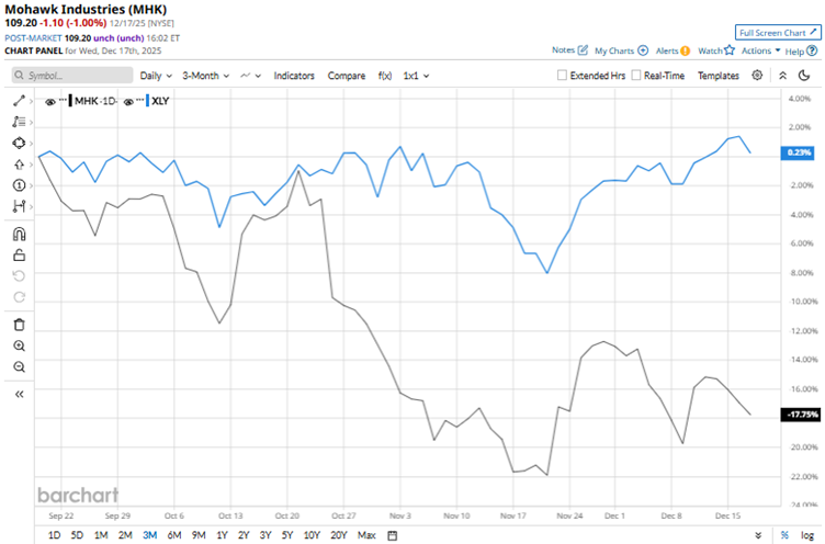 Mohawk’s shares had reached a 52-week high of $143.13 in September, but are down 23.7% from that level. Amid broader market pressures and lukewarm sentiment toward the company, the stock has declined 16.8% over the past three months. On the other hand, the State Street Consumer Discretionary Select Sector SPDR ETF (XLY) is down marginally over the same period. Therefore, the stock has underperformed its sector over this period.
