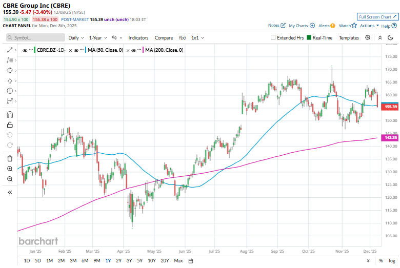 On Oct. 23, shares of CBRE inched higher marginally after the company posted better-than-expected Q3 2025 results, delivering adjusted EPS of $1.61 and a 13.5% year-over-year revenue increase to $10.26 billion. The firm also raised its 2025 core EPS guidance to $6.25–$6.35, supported by strong leasing momentum and solid growth in facilities management amid a rebound in U.S. office activity.