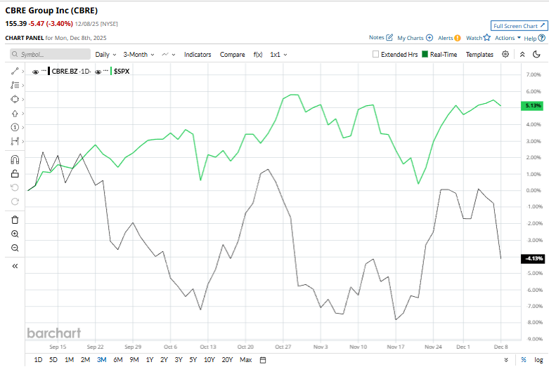 CBRE recently met its 52-week high of $171 on Oct. 23 and is currently trading 9.1% below that level. CBRE has dropped 5% over the past three months, lagging behind the S&P 500 Index ($SPX5.4% surge over the same time frame.