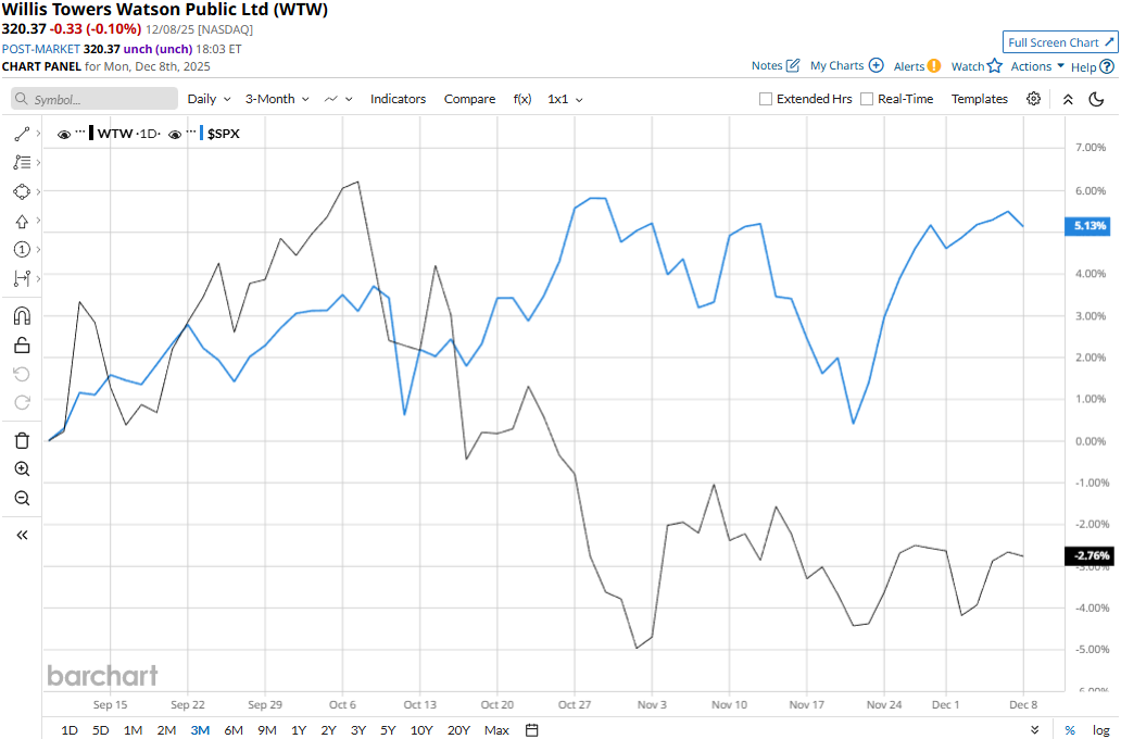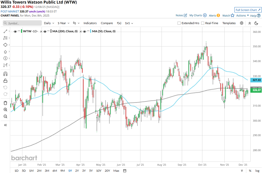 WTW stock has dropped 9.2% from its all-time high of $352.79 touched on Oct. 7. Meanwhile, the stock has declined 3.6% over the past three months, lagging behind the S&P 500 Index’s ($SPX) 5.4% uptick during the same time frame.