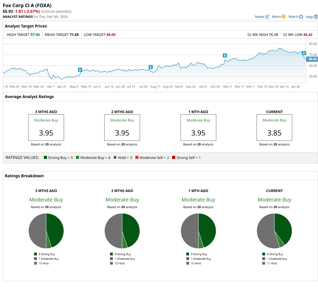 On Feb. 5, Evercore Inc. (EVR) analyst Kutgun Maral maintained a “Hold” rating on FOXA and set a price target of $70, indicating a 6.2% potential upside from the current levels.