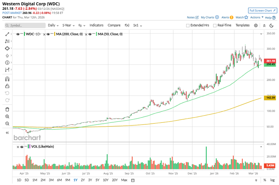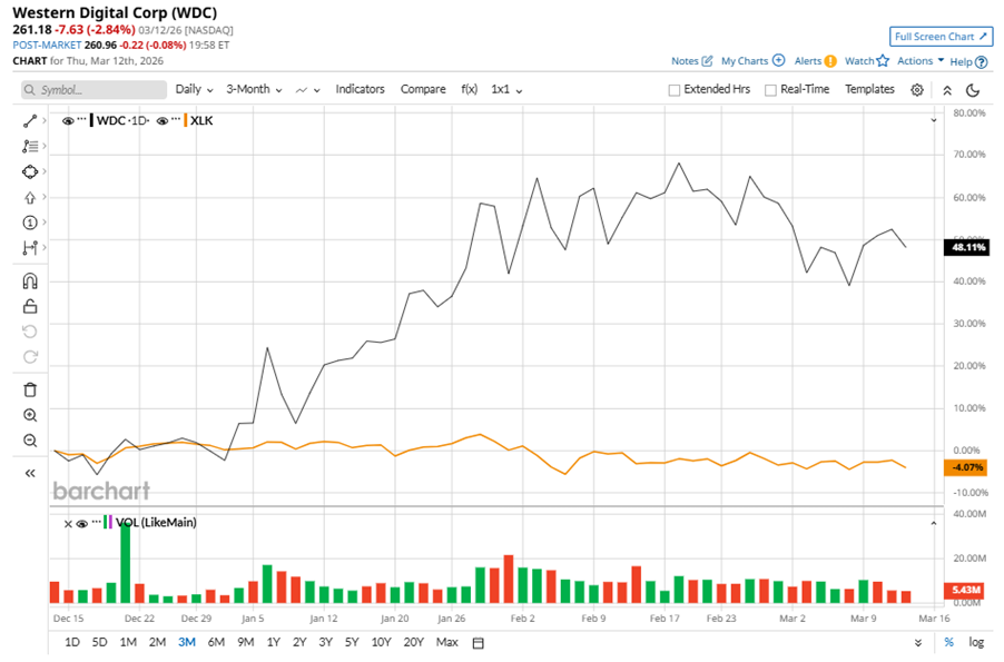 Despite its notable strength, WDC slipped 15.7% from its 52-week high of $309.90, achieved on Feb. 18. Over the past three months, WDC stock gained 48.1%, notably outperforming the Technology Select Sector SPDR Fund’s (XLK) 4.1% losses during the same time frame.