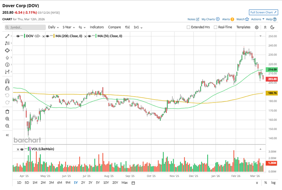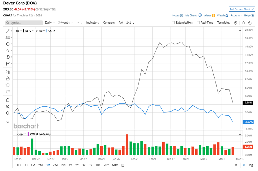 Despite its notable strength, DOV slipped 14.2% from its 52-week high of $237.54, achieved on Feb. 12. Over the past three months, DOV stock gained 2.4%, outperforming the S&P 500 Index’s ($SPX) 2.3% decline during the same time frame.