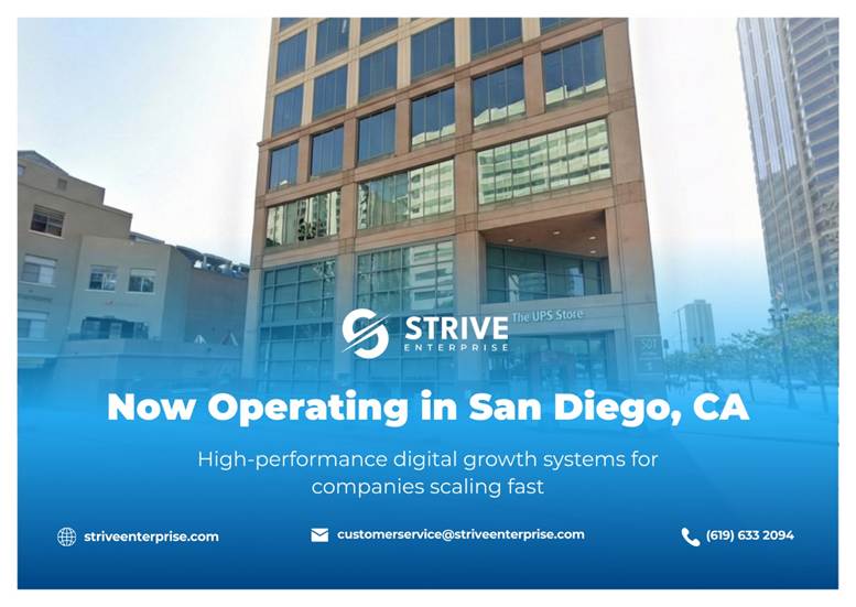 San Diego, CA - Strive Enterprise, a national digital growth company supporting 7- and 8-figure businesses across the United States, has officially opened a new office in San Diego, California, continuing its deliberate expansion into high-impact markets.