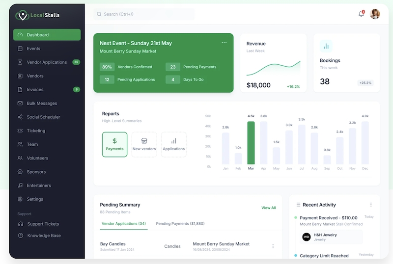 Invoicing is another piece that eats up time when done manually, and it's the part most organisers like least. LocalStalls sends payment requests automatically once a vendor gets approved, tracks who's paid, follows up with the ones who haven't. Connects to Xero and QuickBooks so the accounting side stays current without anyone re-entering numbers at the end of the month. Most organisers got into this work because they care about their community, not because they enjoy chasing people for overdue stall fees.