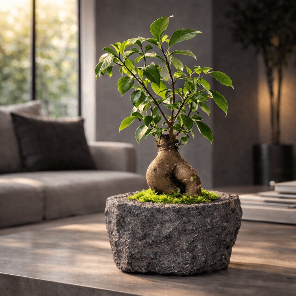 Sculptural living form Ficus bonsai with a delicate branching silhouette, presented in an imported lava rock vessel.