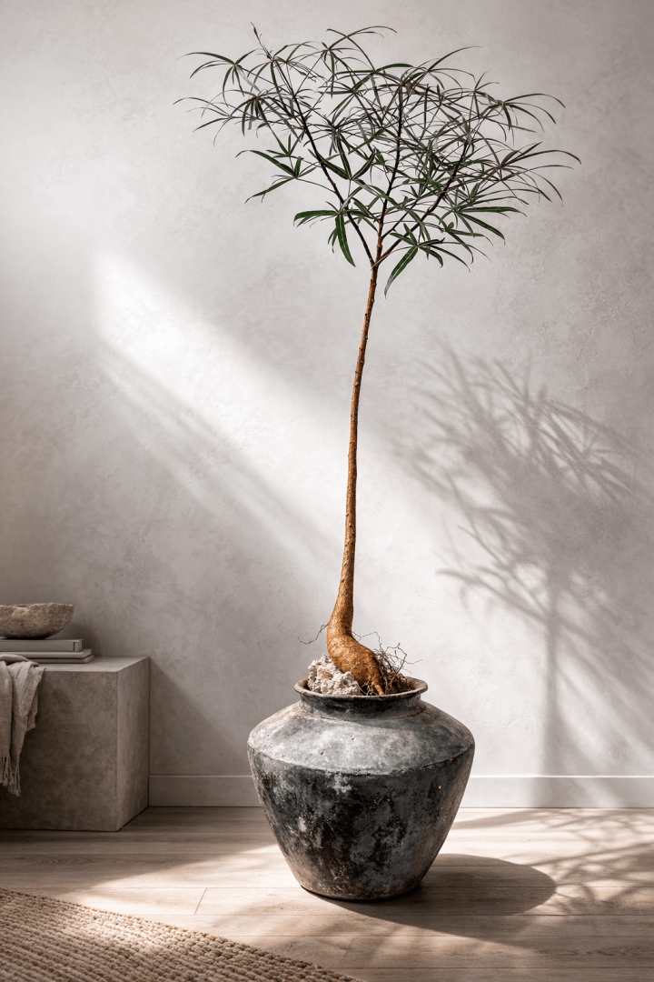 Tall living form Queensland bottle tree (Brachychiton rupestris) with a slender trunk and airy canopy, presented in a Vietnamese terracotta vessel.