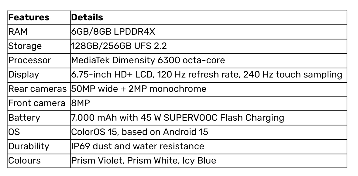 The OPPO K14 5G is built to handle the demands of everyday life. With an IP69 rating, it offers protection against dust and high-pressure water jets, something rarely seen at this price point. Whether it is a rainy commute or an accidental splash, the phone holds up without a worry. It is available in three clean, minimal colour options — Prism Violet, Prism White, and Icy Blue.
