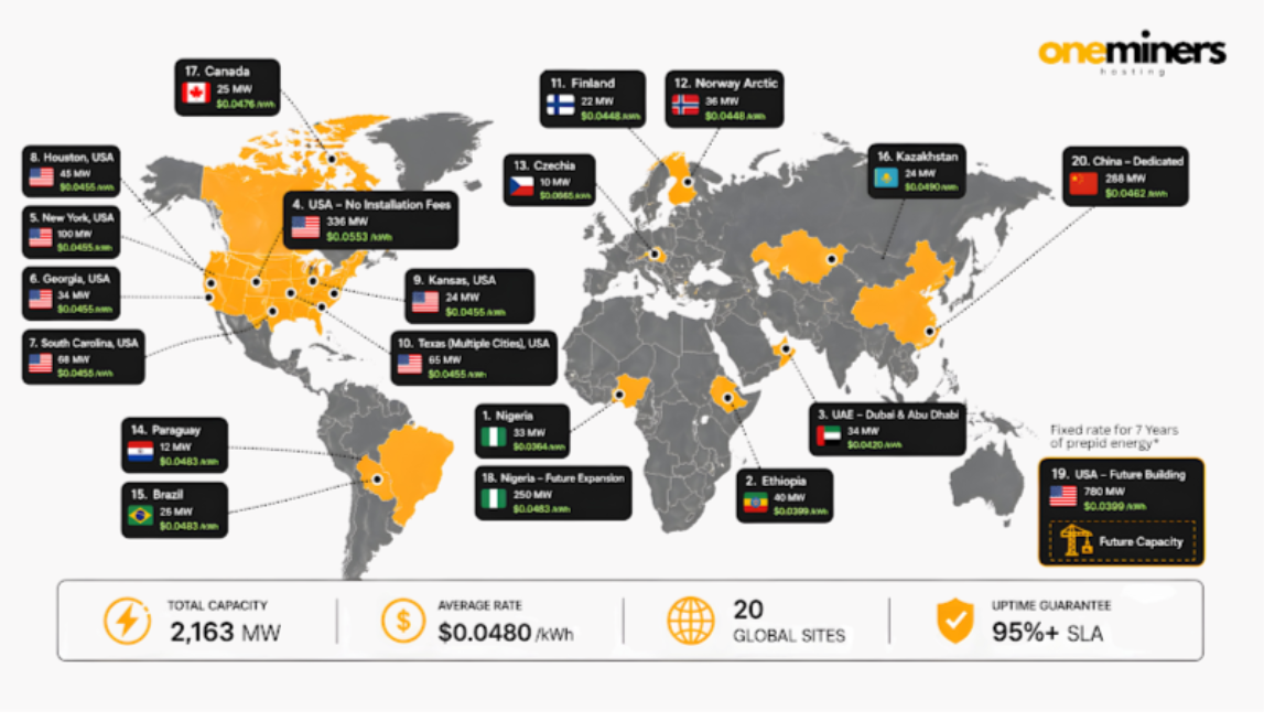 The network includes facilities in Nigeria, Ethiopia, the United Arab Emirates, the United States, Finland, Norway, Germany, Paraguay, Brazil, Kazakhstan, and Canada. Oneminers stated that all 17 locations are either fully operational or ready for immediate deployment, with average uptime exceeding 98 percent and a minimum service-level guarantee of 95 percent, below which clients are fully compensated.