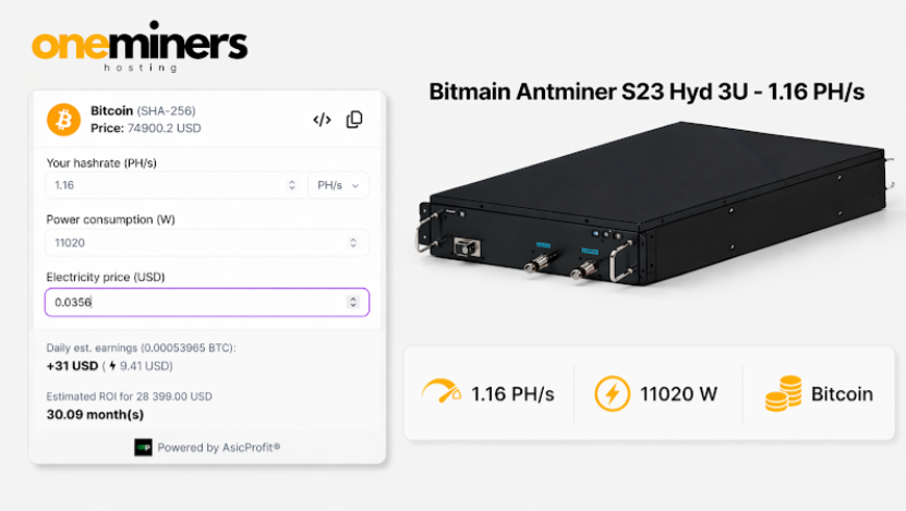 Oneminers’ profitability model is primarily driven by its ability to secure long-term, fixed electricity pricing combined with large-scale operational efficiency. By offering hosting rates as low as $0.0455 per kWh in key markets such as the United States, the company positions its clients to operate significantly below the industry average cost of production, which is a critical determinant of mining margins. The seven-year fixed power contracts further reduce exposure to energy price volatility—historically one of the biggest risks in Bitcoin mining—allowing for more predictable cash flow modeling and long-term planning. When combined with high uptime levels, rapid deployment capabilities, and the use of modern ASIC hardware such as the Bitmain Antminer S23 series, these factors can materially improve breakeven timelines. Under stable network conditions and favorable Bitcoin pricing, such a structure has the potential to deliver return on investment within a sub-12-month horizon, with accelerated scenarios and smart AI mining feature approaching 8 months depending on market variables, mining difficulty, and individual operational configurations.