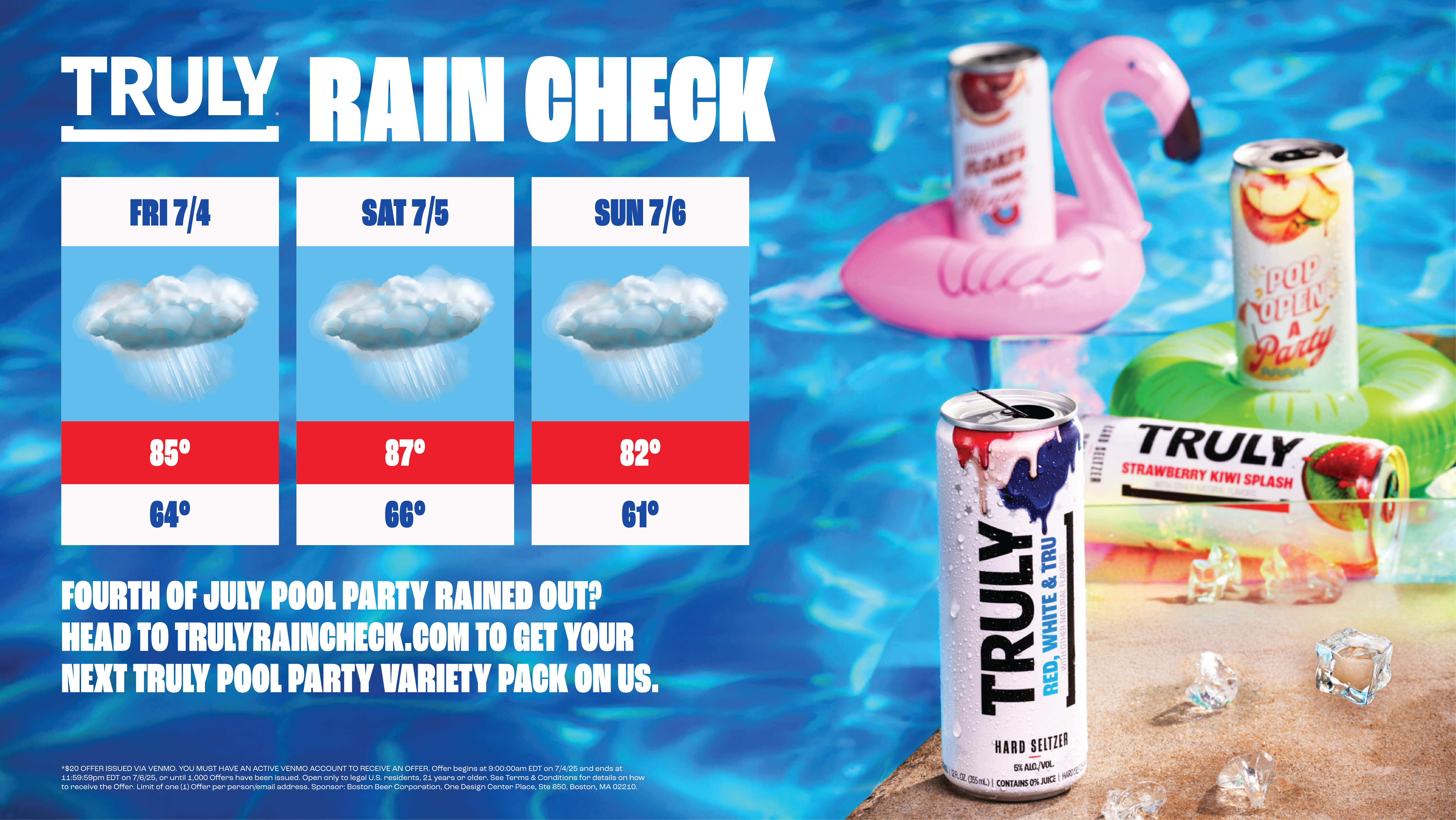- Rain Check, Please! Truly Hard Seltzer is Paying Fans with a “Rain Check” to Use on Their Next Pack If Fourth of July Plans Get Rained Out