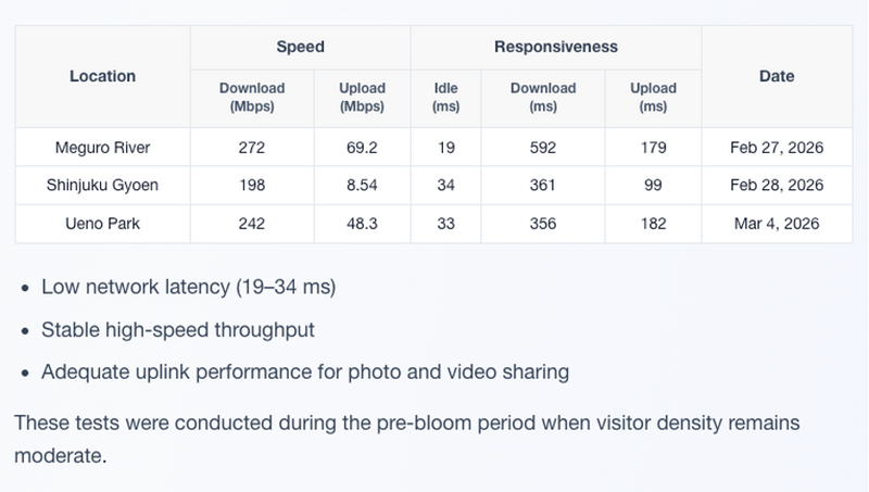 The measurements were carried out at three of the city’s best-known cherry blossom destinations — Ueno Park, Meguro River and Shinjuku Gyoen National Garden — using a local travel eSIM connected directly to Japan’s domestic au mobile network operated by KDDI.