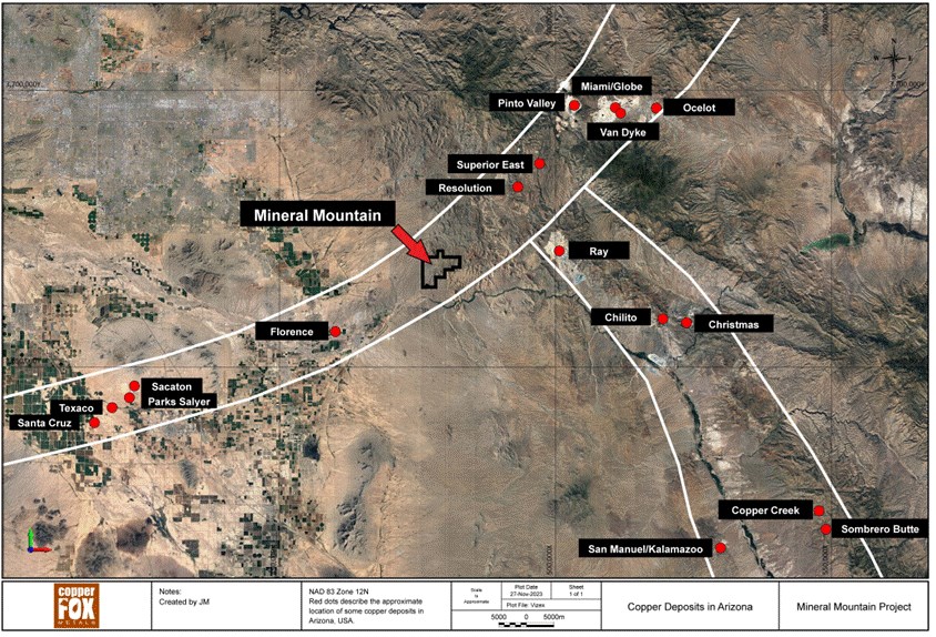 Calgary, Alberta--(Newsfile Corp. - October 28, 2025) - Copper Fox Metals Inc. (TSXV: CUU) (OTCQX: CPFXF) (FSE: HPU) ("Copper Fox" or the "Company") and its wholly owned subsidiary, Desert Fox Mineral Mountain Co. ("Desert Fox"), are pleased to announce that drilling operations have commenced on its 100% owned Mineral Mountain porphyry copper project in Arizona. The Mineral Mountain project is located on a prolific northeast trending porphyry copper belt approximately 25 kilometers (km) southwest from Rio Tinto and BHP's giant Resolution porphyry copper-molybdenum deposit and approximately 20km northeast of the Florence porphyry copper deposit (Figure-1).