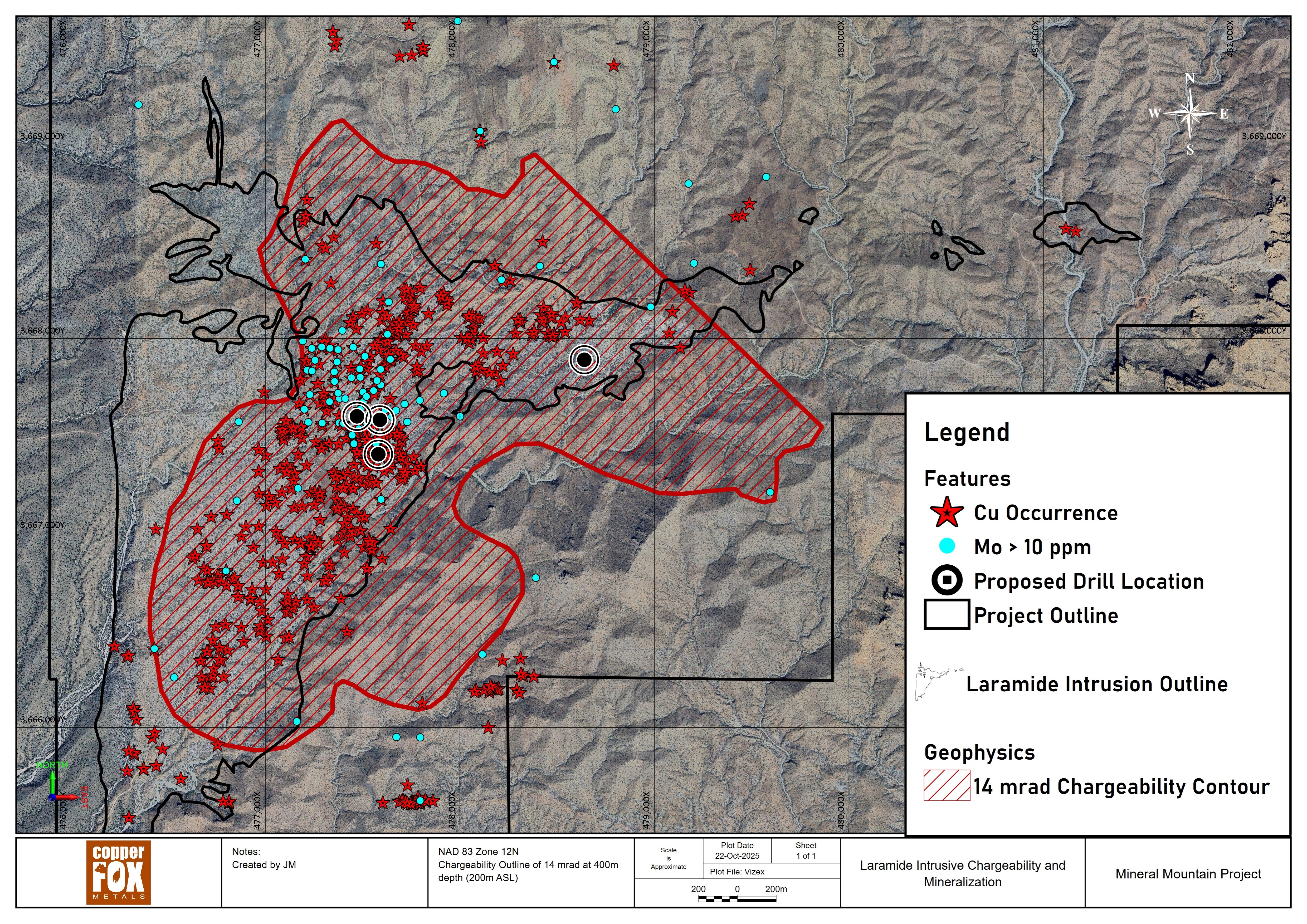 The objective of the 2025 drilling program is to drill test the depth extent of the porphyry style copper-molybdenum mineralization and alteration exposed on surface and determine the cause of the underlying, equally large open-ended chargeability anomaly. Figure-2 shows the distribution of the copper-molybdenum mineralization, the underlying open-ended positive chargeability anomaly, and the locations of drillholes approved in the Plan of Operation filed with the Bureau of Land Management for the project.