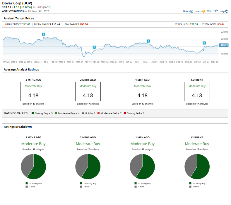 Last month, RBC Capital raised its price target on Dover to $198 from $183, while keeping a “Sector Perform” rating.
