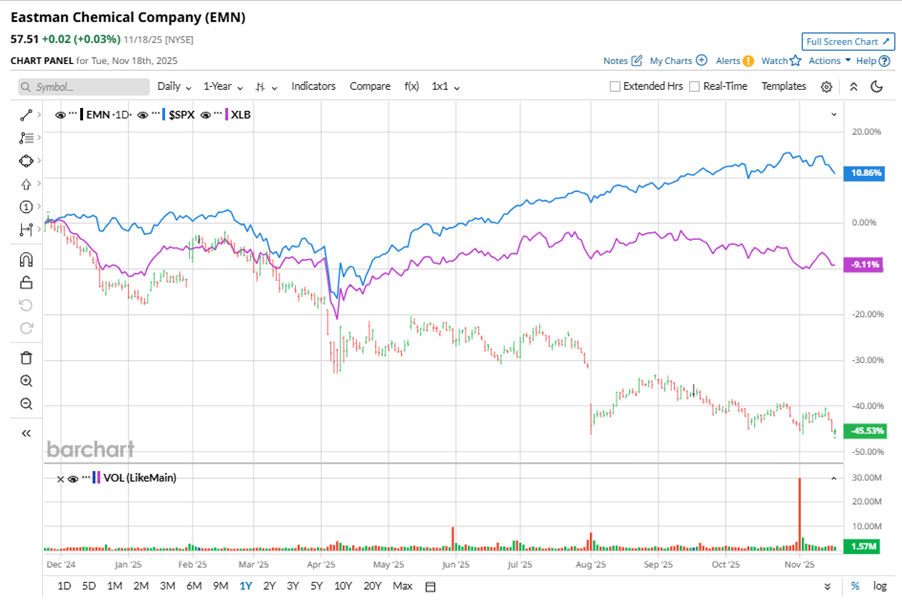 Shares of this specialty chemicals giant have considerably underperformed the broader market over the past year. EMN has declined 44.7% over this time frame, while the broader S&P 500 Index ($SPX) has rallied nearly 12.3%. In 2025, EMN’s stock fell 37%, compared to the SPX’s 12.5% rise on a YTD basis.