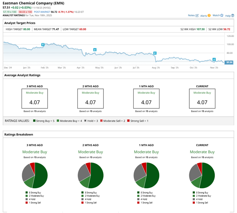 Among the 15 analysts covering EMN stock, the consensus is a “Moderate Buy.” That’s based on eight “Strong Buy” ratings, two “Moderate Buys,” four “Holds,” and one “Strong Sell.”