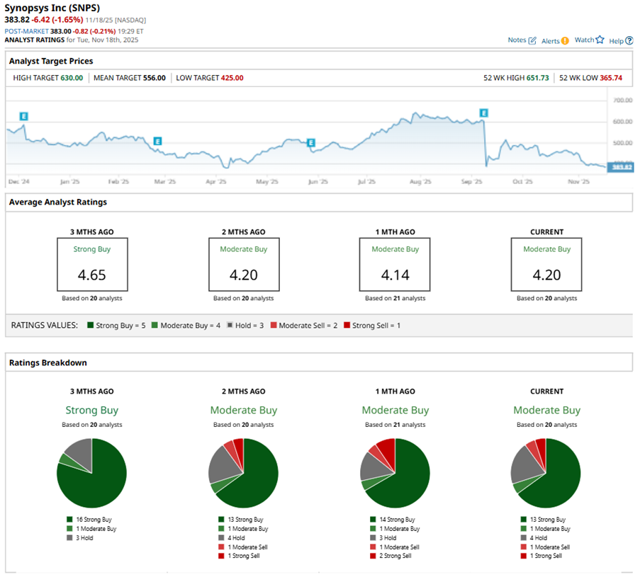 On Nov. 13, Mizuho Financial Group, Inc. (MFG) analyst Siti Panigrahi reiterated a “Buy” rating on SNPS and set a price target of $600, implying a potential upside of 56.3% from current levels.