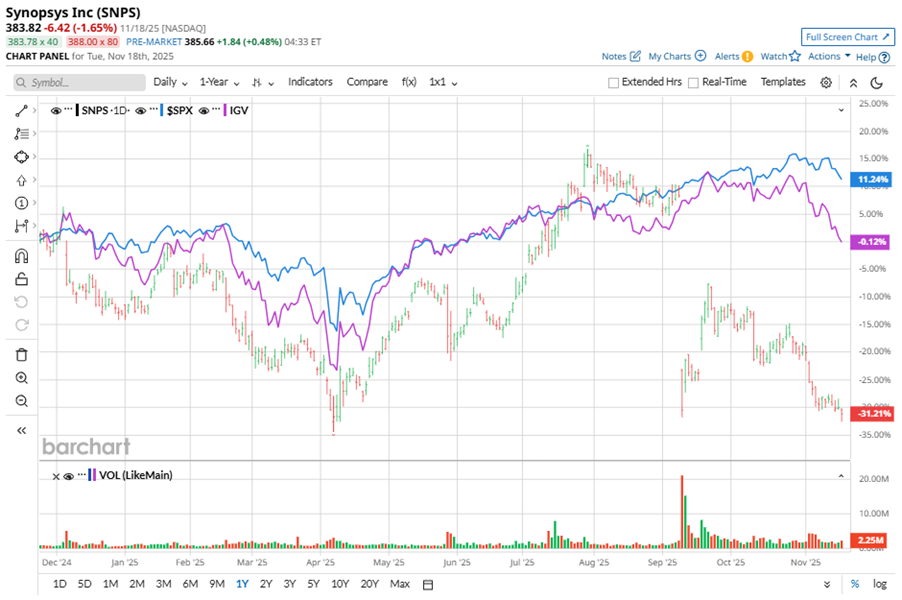 Shares of this global leader in EDA have notably underperformed the broader market over the past year. SNPS has declined 26.8% over this time frame, while the broader S&P 500 Index ($SPX) has rallied nearly 12.3%. In 2025, SNPS’ stock fell 20.9%, compared to the SPX’s 12.5% rise on a YTD basis.