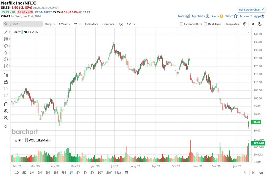 Shares of streaming leader Netflix (NFLX) have remained under sustained pressure, declining 22.66% over the past three months. Even a stronger-than-expected fourth-quarter earnings report failed to reverse sentiment, as the stock extended losses in pre-market trading and signaled persistent investor caution.
