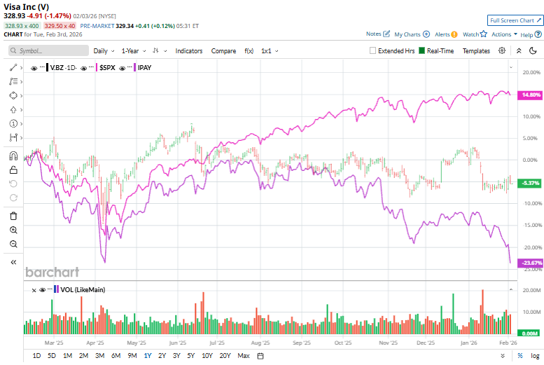 Despite its reputation as a global payments powerhouse, Visa has struggled to keep pace with the broader market over the past year. Visa has declined 4.9% over this time frame, while the broader S&P 500 Index ($SPX) has soared 15.4%. Moreover, on a YTD basis, the stock is down 6.2%, compared to SPX’s 1.1% uptick.