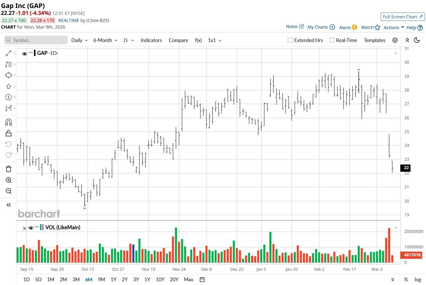 Following this recent plunge, Gap stock is trading down about 23% versus its year-to-date high.