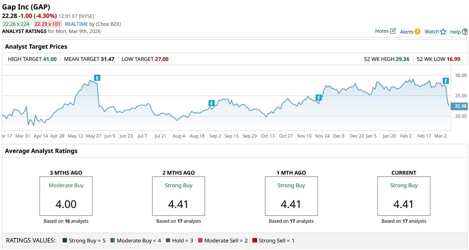 The consensus rating on Gap also sits at “Strong Buy,” with the mean price target of about $31 indicating potential upside of roughly 40% from here.