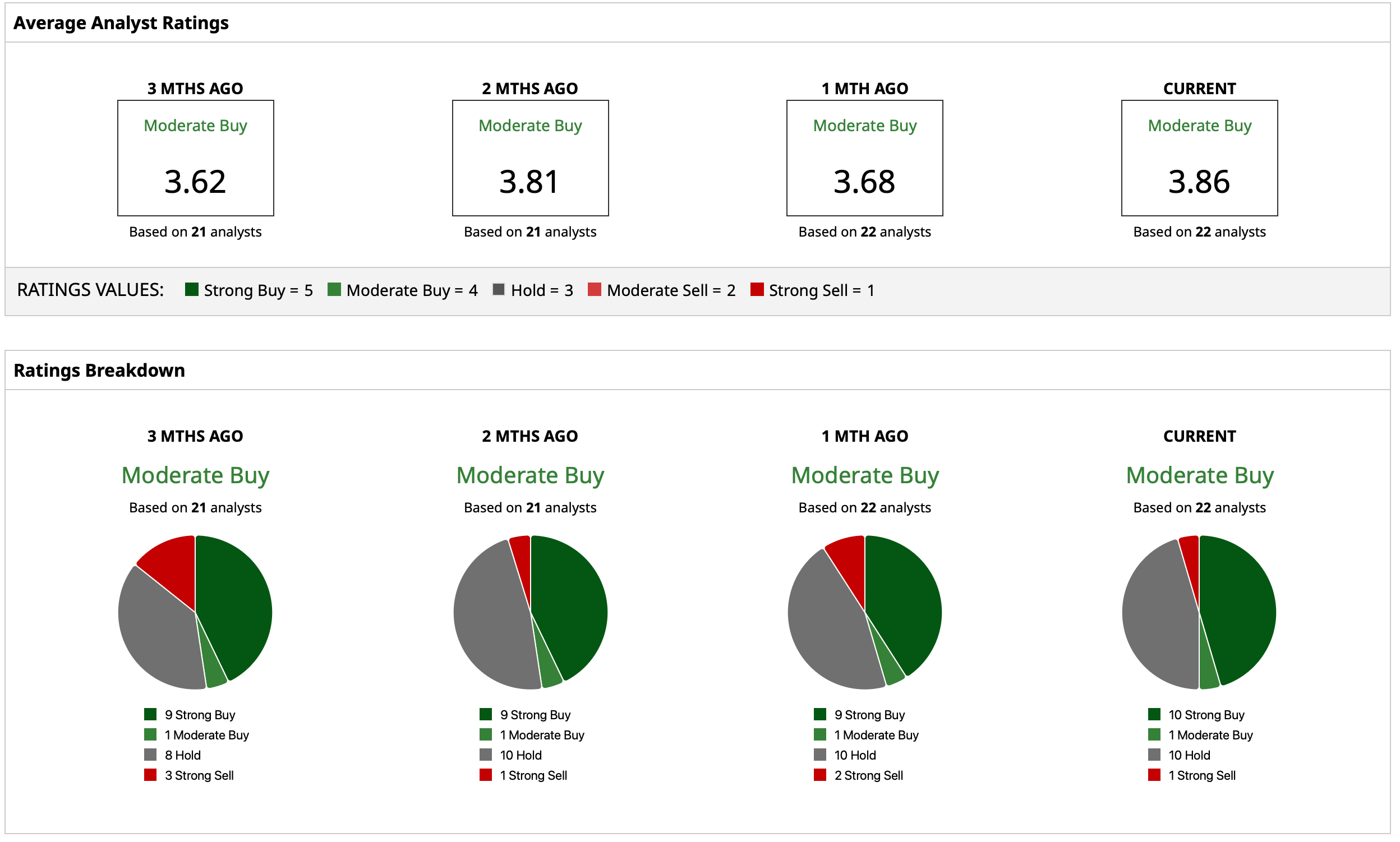 Thus, analysts have deemed CRCL stock a “Moderate Buy,” with a mean target price of $126.28. This indicates an upside potential of about 34% from current levels. Out of 22 analysts covering the stock, 10 have a “Strong Buy” rating, one has a “Moderate Buy” rating, 10 have a “Hold” rating, and one has a “Strong Sell” rating.