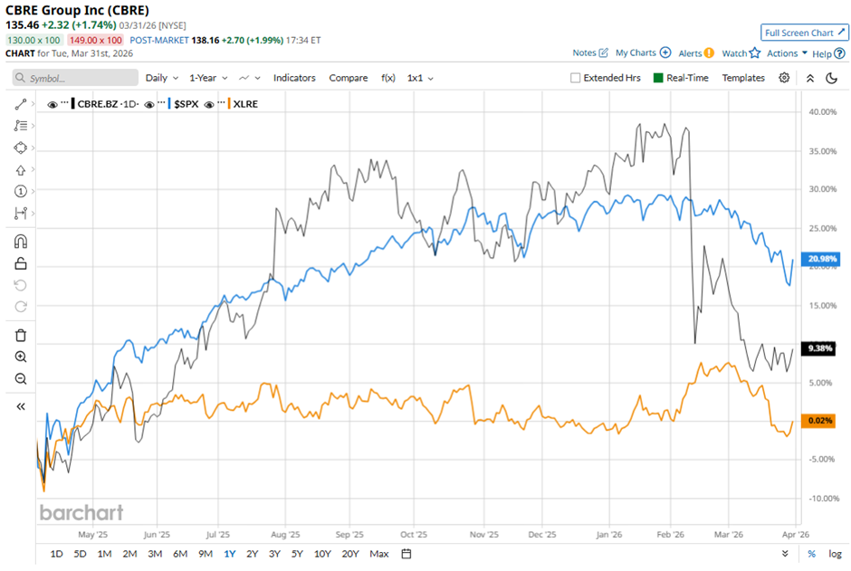 CBRE stock has risen 4.6% over the past 52 weeks, lagging behind the broader S&P 500 Index's ($SPX) nearly 17% gain. However, the stock has outperformed the State Street Real Estate Select Sector SPDR ETF's (XLRE1.4% decline over the same time frame.