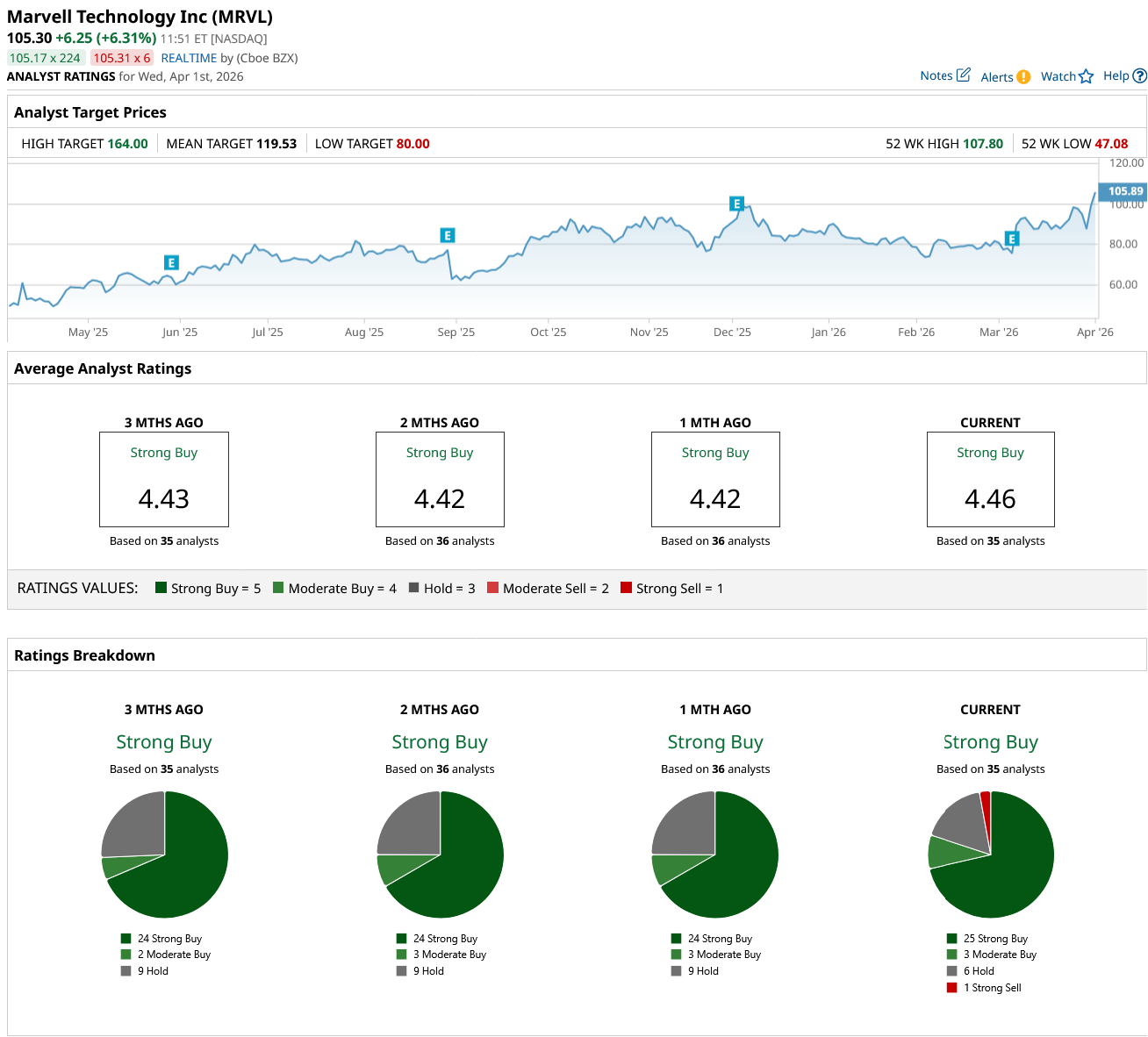 Out of the 35 analysts covering MRVL stock, 25 recommend “Strong Buy,” three recommend “Moderate Buy,” six recommend “Hold,” and one recommends “Strong Sell.” The average Marvell stock price target is $119.53, above the current price of $105.