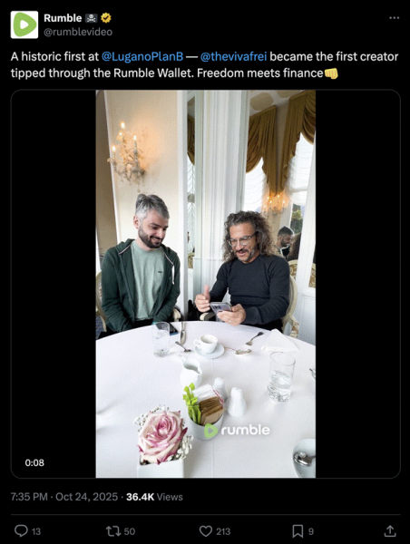 Video platform Rumble is rolling out Bitcoin tipping for its 51 million monthly users, thanks to a new partnership with Tether. The feature is currently in testing and is expected to launch publicly by early to mid-December, according to announcements made at the Plan ₿ Forum in Lugano, Switzerland.