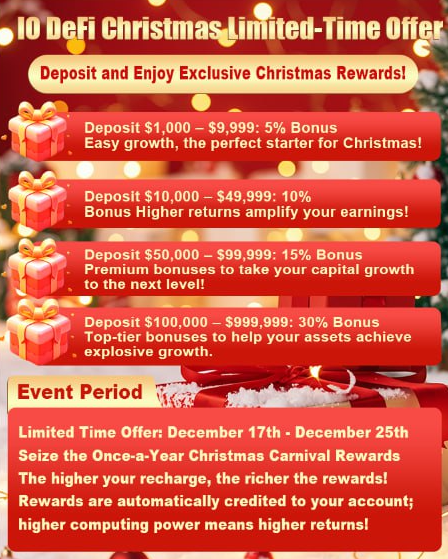 As its user base continues to expand, IO DeFi has been continuously promoting more robust and standardized operating methods in recent years, strengthening long-term connections with global users. This Christmas limited-time event is a phased benefit arrangement launched by the platform at the end of the year, reflecting its emphasis on user experience and community building.