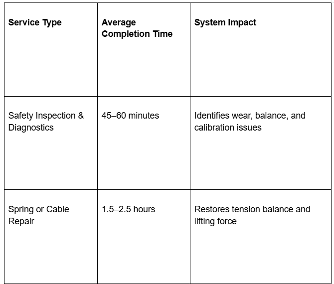 Most standard repairs such as spring, cable, or opener adjustments take between one and three hours depending on system condition. Complex issues involving alignment or multiple components may require additional diagnostic and calibration time.