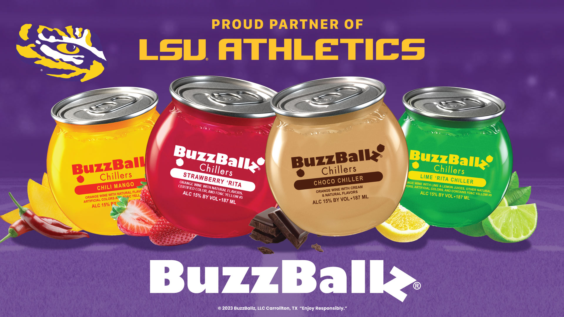 Four SKUs of wine-based BuzzBallz Chillers will be available in both the LSU Tiger Stadium and at the PMAC (Pete Maravich Assembly Center). The ready-to-drink cocktails will be proudly partnered with LSU football, baseball, and mens and womens basketball.