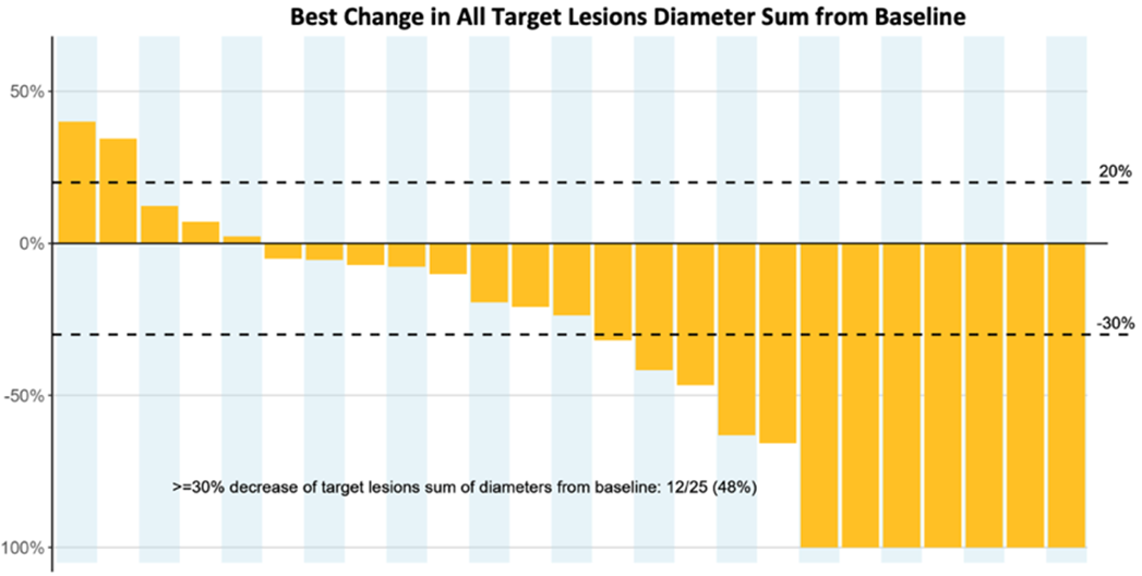 - 48.0% (12/25) all target lesions response (≥ 30% change in target lesion sum of diameters; see below)